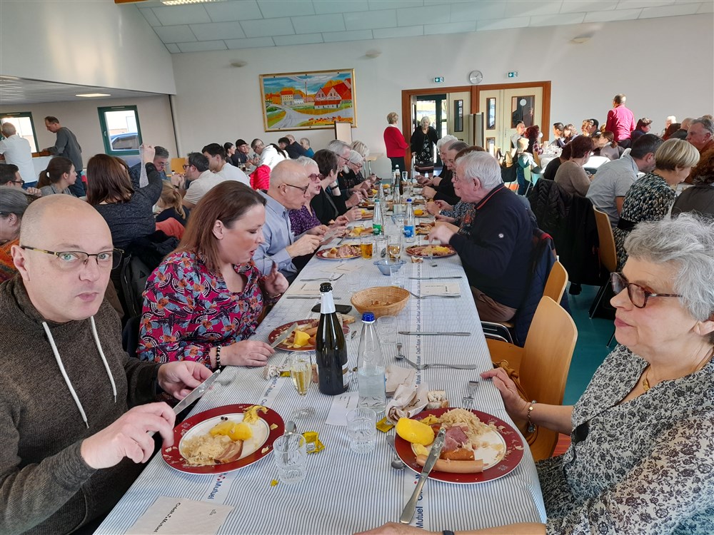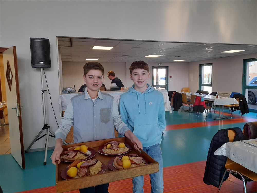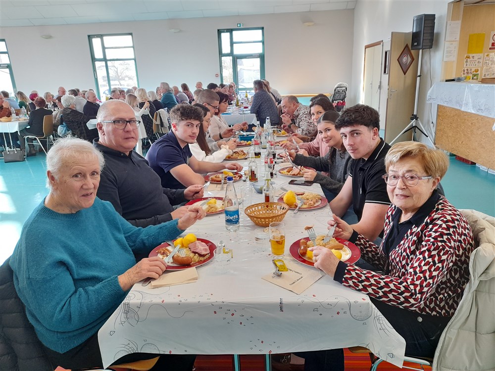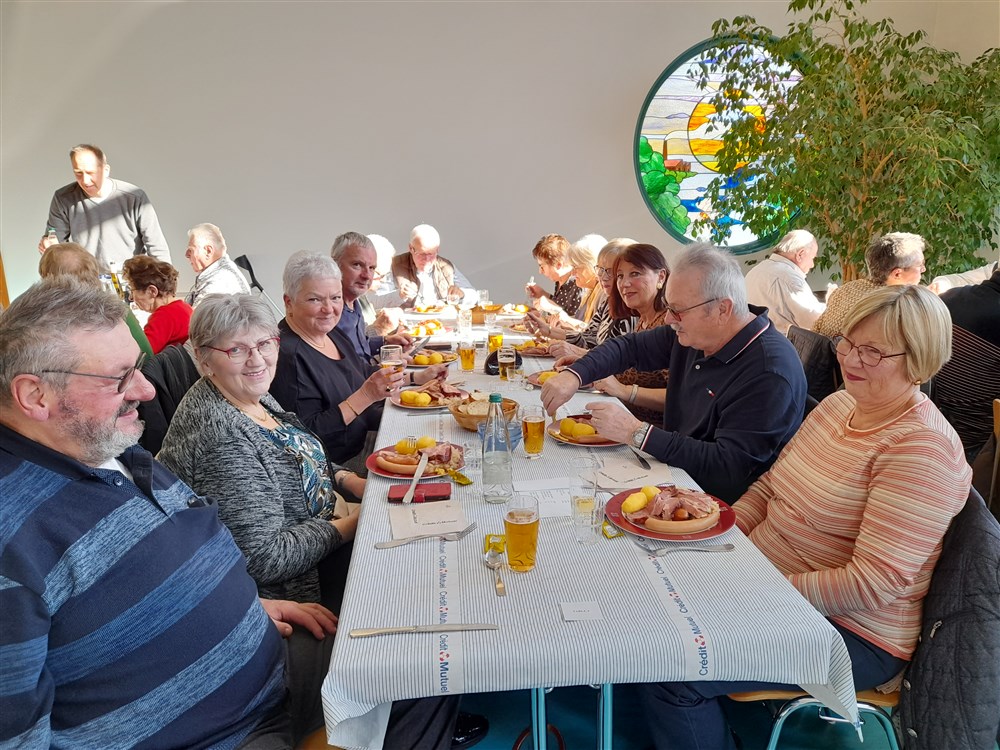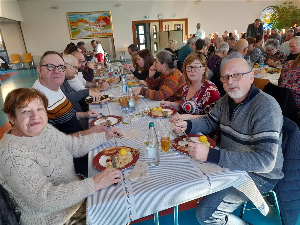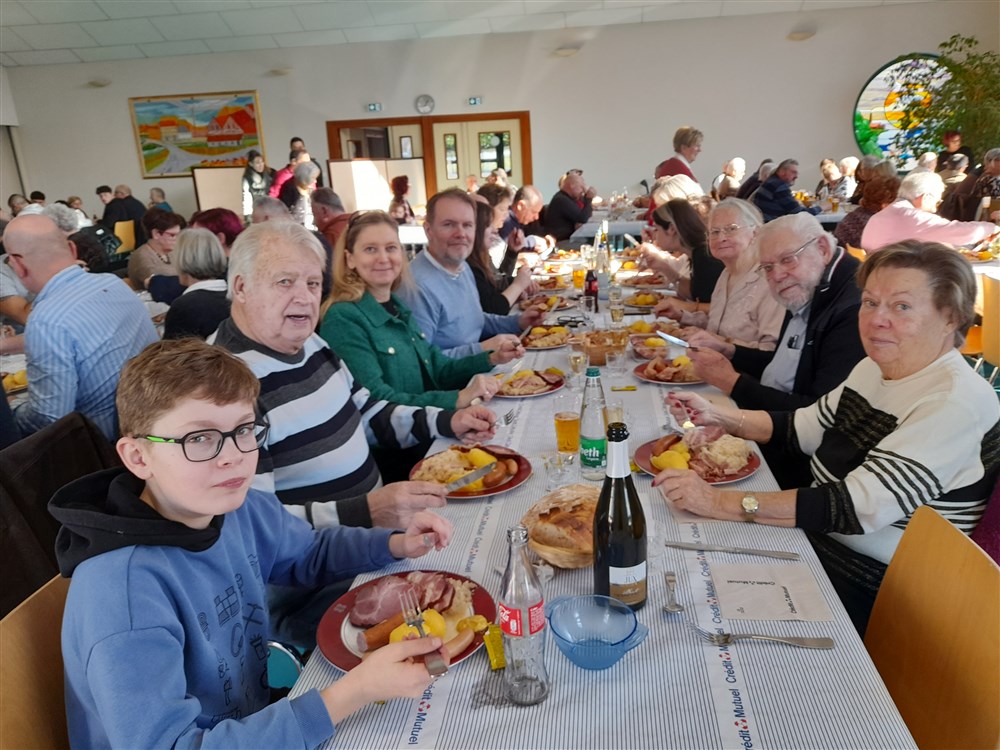 Le repas paroissial a eu lieu le dimanche 21 janvier 2024 : au menu la traditionnelle choucroute garnie et le conseil de fabrique a été soutenu pour la 2ème année par Charles Wersinger et de son fils Florian pour son élaboration. Choucroute et son accompagnement étaient excellents. Le dessert : la bonne glace apportée par Pascal Herzog, qui répond toujours présent. Les pâtissières du village ont aussi confectionné des cakes pour agrémenter le café, tout comme le digestif apporté par Philippe.