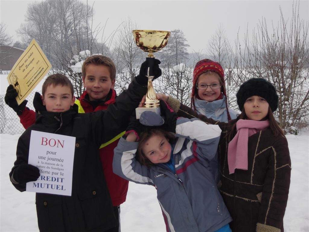 Le 18 octobre a eu lieu le rituel cross des écoles du Sundgau réunissant 55 classes du CE1 au CM2, soit plus de 1200 élèves, à Ueberstrass. Ce sont les 5 enfants du CM1 de Madame Salvin qui ont gagné dans leur catégorie le challenge de cette année, réalisant le deuxième temps de l’histoire du cross, c’est-à-dire 15 minutes pour un parcours de 2800 m. La remise des prix a eu lieu le 2 décembre au Crédit Mutuel (partenaire inconditionnel de la manifestation) de Seppois le Haut. C’est avec une immense fierté que les enfants ont rapporté, un diplôme, une coupe qui sera remise en jeu l’année prochaine ainsi qu’un magnifique cadeau : une journée à la maison de la nature. Ce fut Noël avant l’heure pour ces jeunes champions !