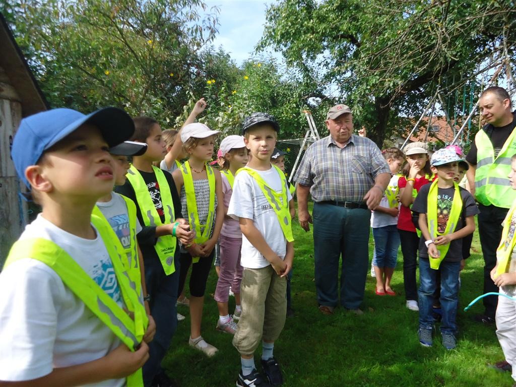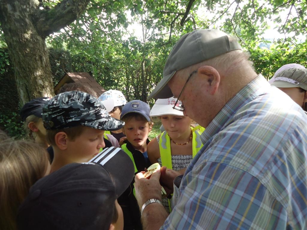 Mais avant la dégustation, les enfants ont découvert le verger avec une nombreuse variété d’arbres fruitiers, dont des pommiers. Hubert Stemmelen est très soucieux d’avoir des fruits sans traitement chimique, et il a expliqué aux enfants, les procédés naturels, comme le piège à carpocapse, qui permet d’attirer l’insecte, très nuisible, dont la larve pénètre les fruits.